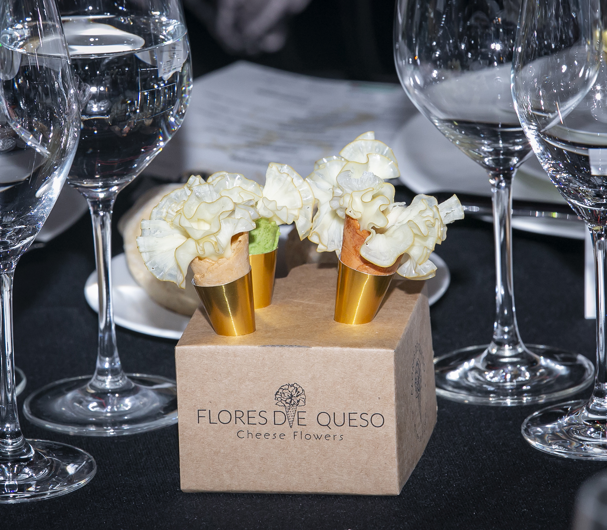 La parte gastronómica corrió a cargo de Zalacaín y del catering de U-Zalacaín. Los aperitivos, que fueron servidos en mesa, constaron de un corte de foie con teja crujiente de naranja y gelé de PX, las llamativas Flores de Queso, acompañados de un jamón ibérico de bellota D.O. Jabugo y mantequilla artesanal del restaurante Zalacaín.