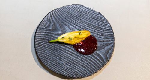 Con el reloj pisándoles los talones, prepararon también unas flores guisadas para reflexionar sobre los sustitutivos de la carne sacados directamente de la tierra. Olleros contaba que “tenemos que pensar en aportar un valor a la sociedad que vivimos a través de la compensación de excesos como la carne”. Estofaron lirios e hibiscos que acompañaron con un pepino macerado en grasa y garum de vaca gallega.