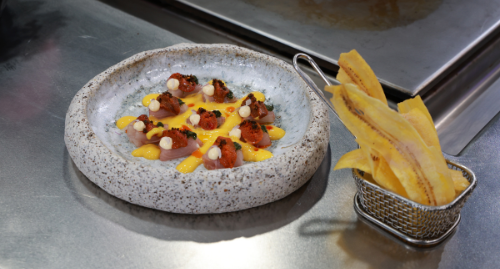 Cebiche de amachi, mojo andino y especias asiáticas con chips de plátano macho de Dabiz Muñoz