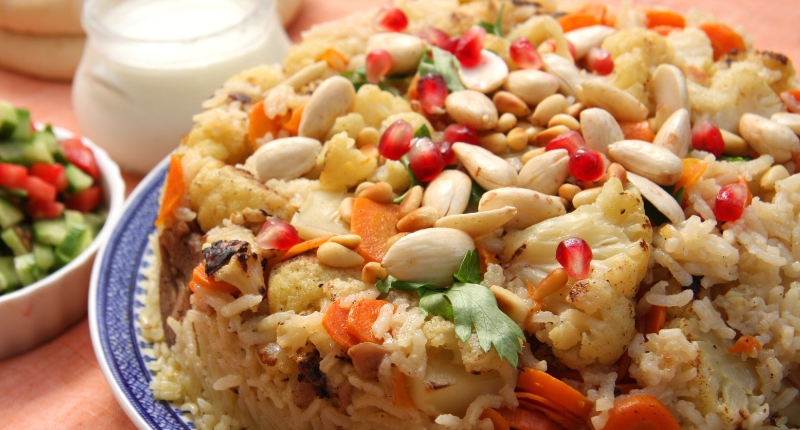 Para los árabes su nombre significa al revés y derivado de la técnica para llegar a su resultado. Se trata de un plato hecho a base de arroz, carne (cordero o pollo) y verduras como berenjena o coliflor. La clave es prepararlo en una olla profunda que se voltea antes de servir, formando una torre colorida. A menudo se adorna con frutos secos tostados y perejil fresco.