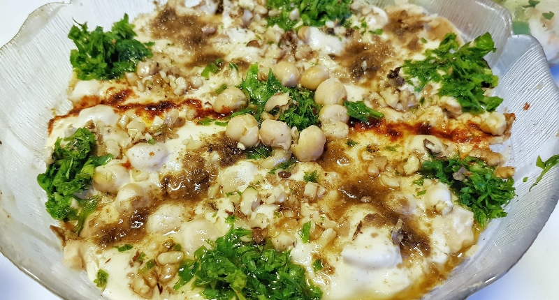 Para hacerlo se debe cortar en triángulos y cubrir con una mezcla de yogur, garbanzos cocidos y frutos secos tostados, y se le añaden ajo, cilantro, comino o arroz, según la región.