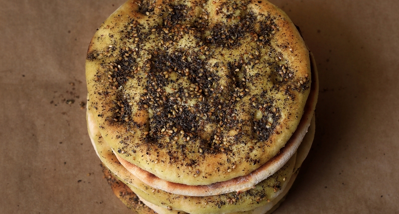 La llamada “pizza árabe”, es una preparación libanesa que utiliza pan tostado como base y se cubre con zaatar (mezcla de tomillo, orégano y sésamo), aceite de oliva y otros ingredientes, como carne de cordero, queso o verduras. Suele comerse en los desayunos o incluso ser común en ventas ambulantes.